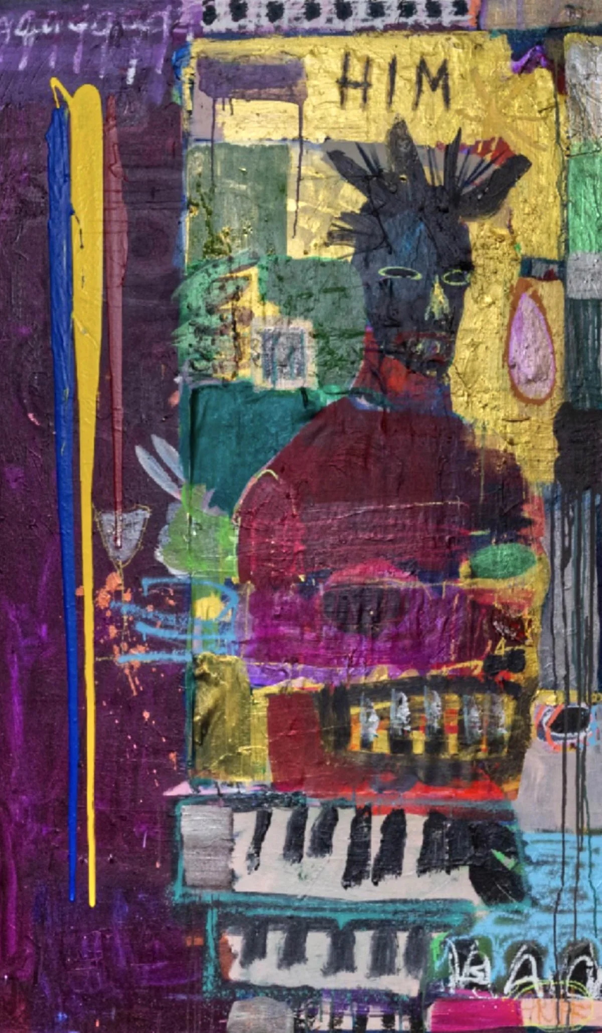 Aerosol, acrylic, oil stick, streaker on canvas