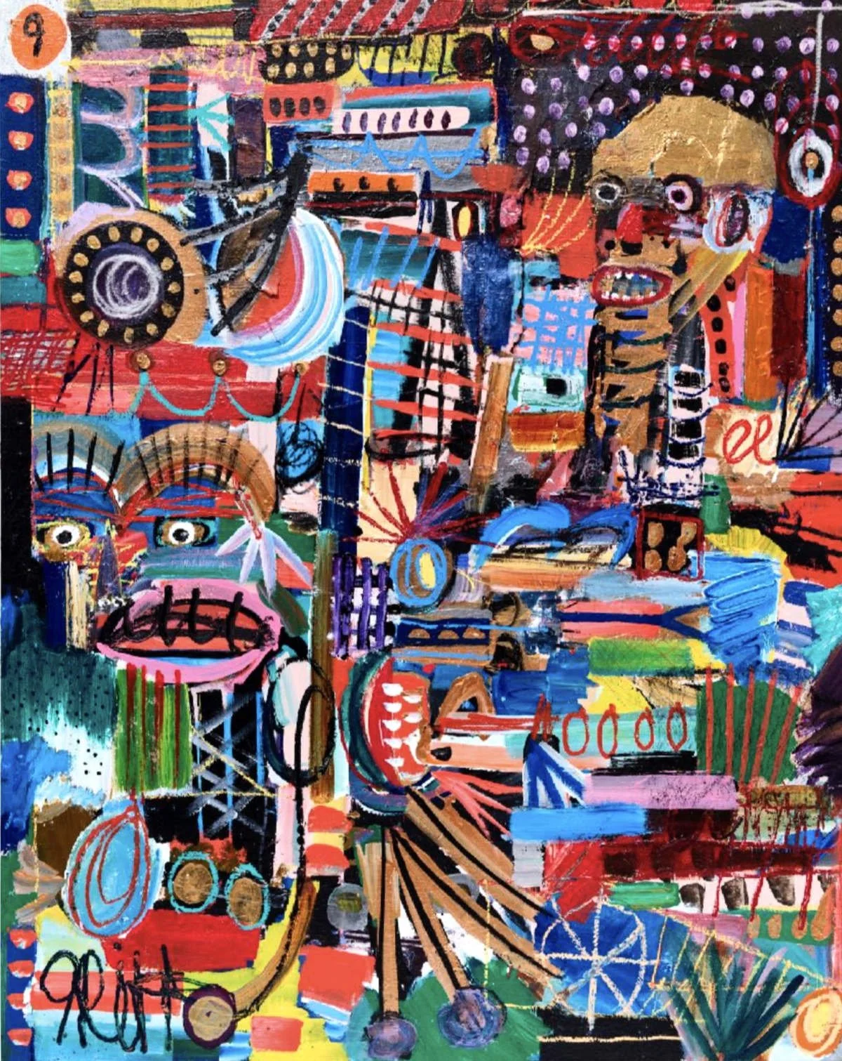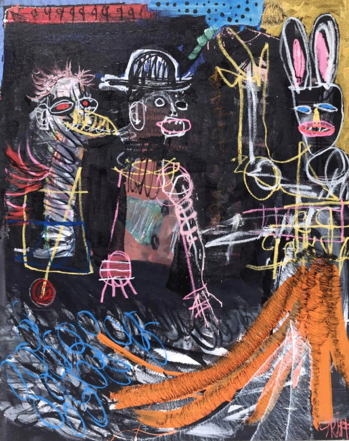 Aerosol, acrylic, oil stick, streaker, marker, lava gel on canvas